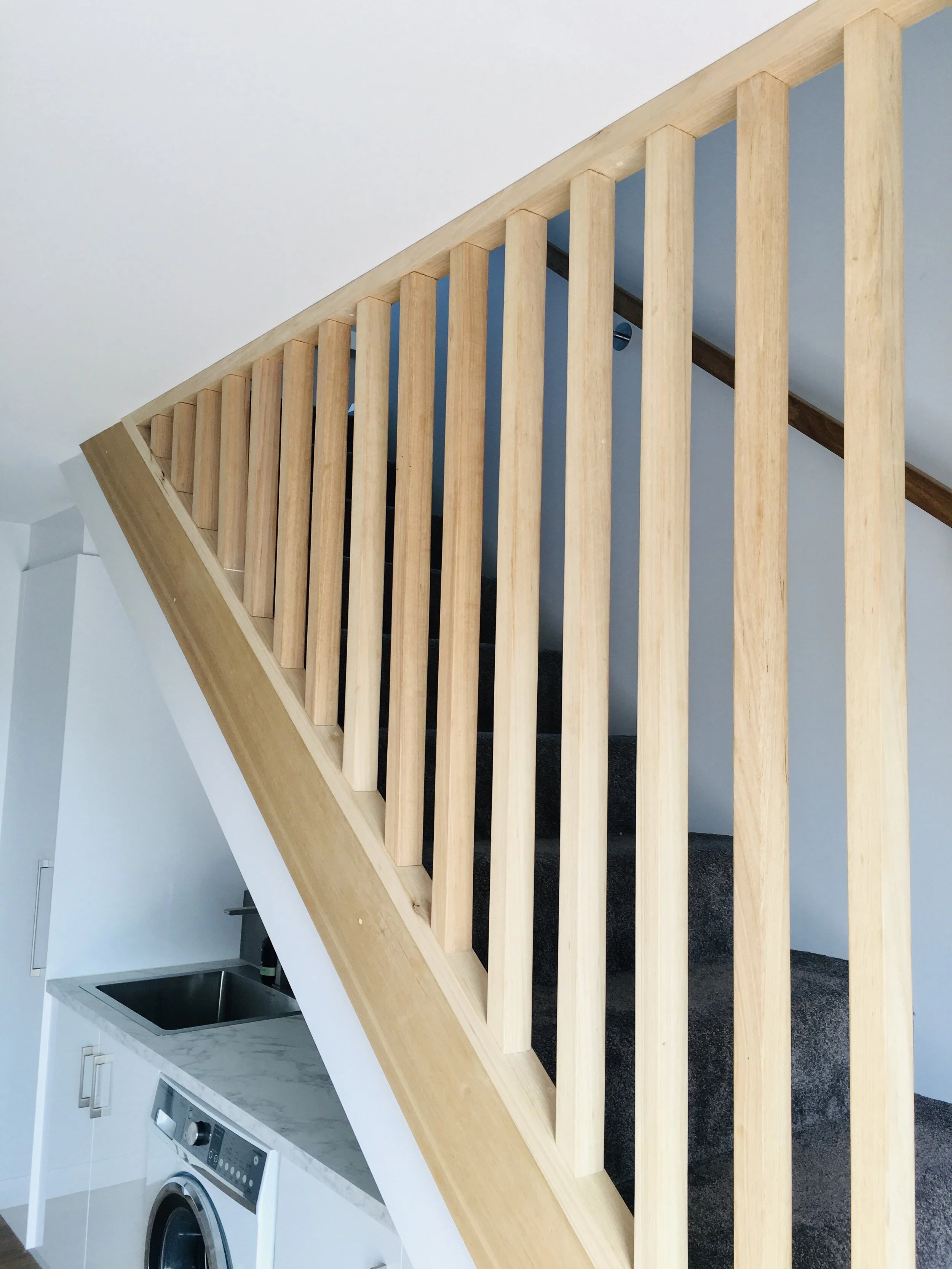 Constructed from steel portal frames and cladded with colorbond nailstrip in matt monument. Some features illustrated above include custom made spotted gum entrance door, gable lined with spotted gum and custom made staircase to the mezzanine floor with Tasmanian oak balustade and hand rail.
